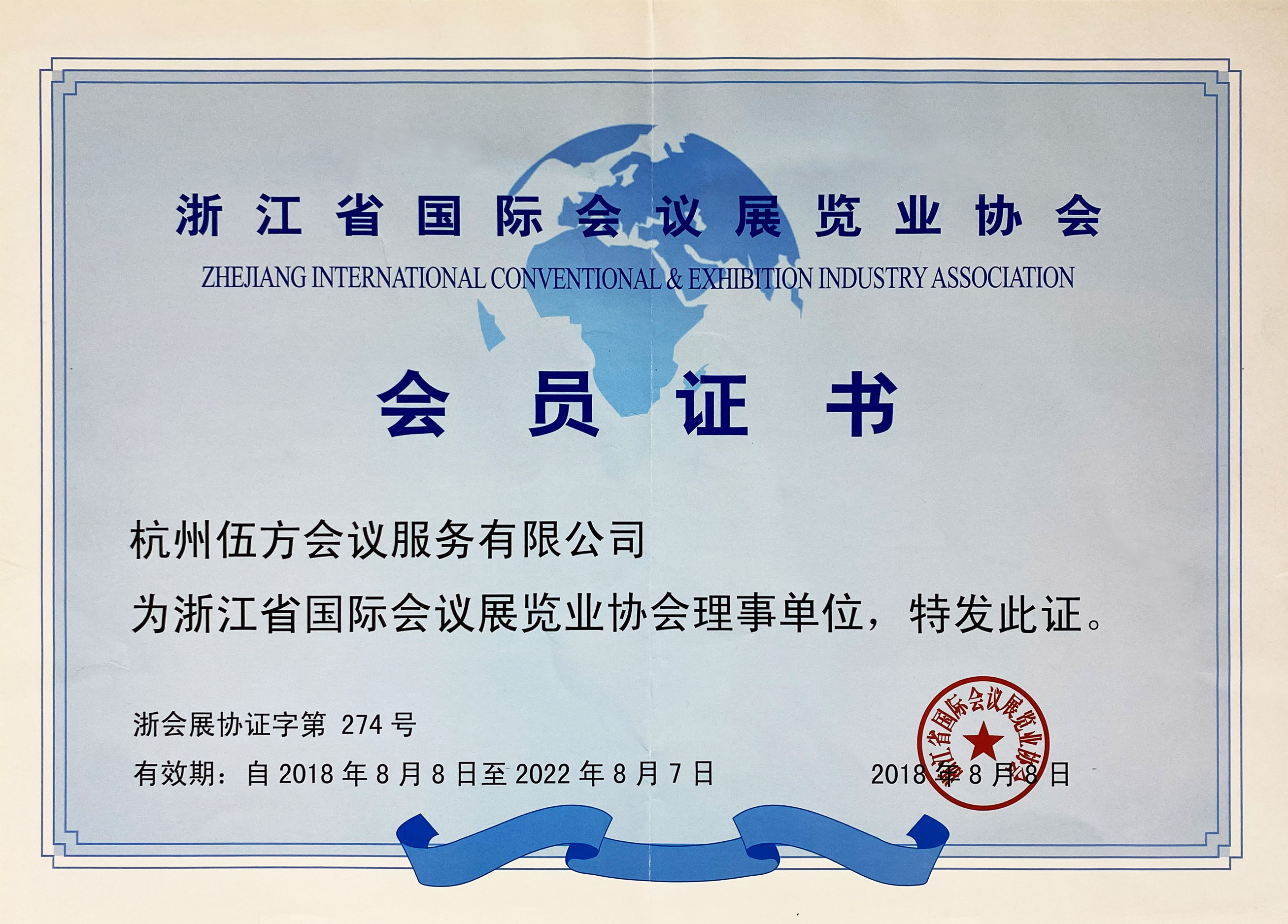 杭州伍方會(huì)議服務(wù)有限公司為浙江省國(guó)際會(huì)議展覽業(yè)協(xié)會(huì)理事單位,有效期自2018年8月8日至2022年8月7日。