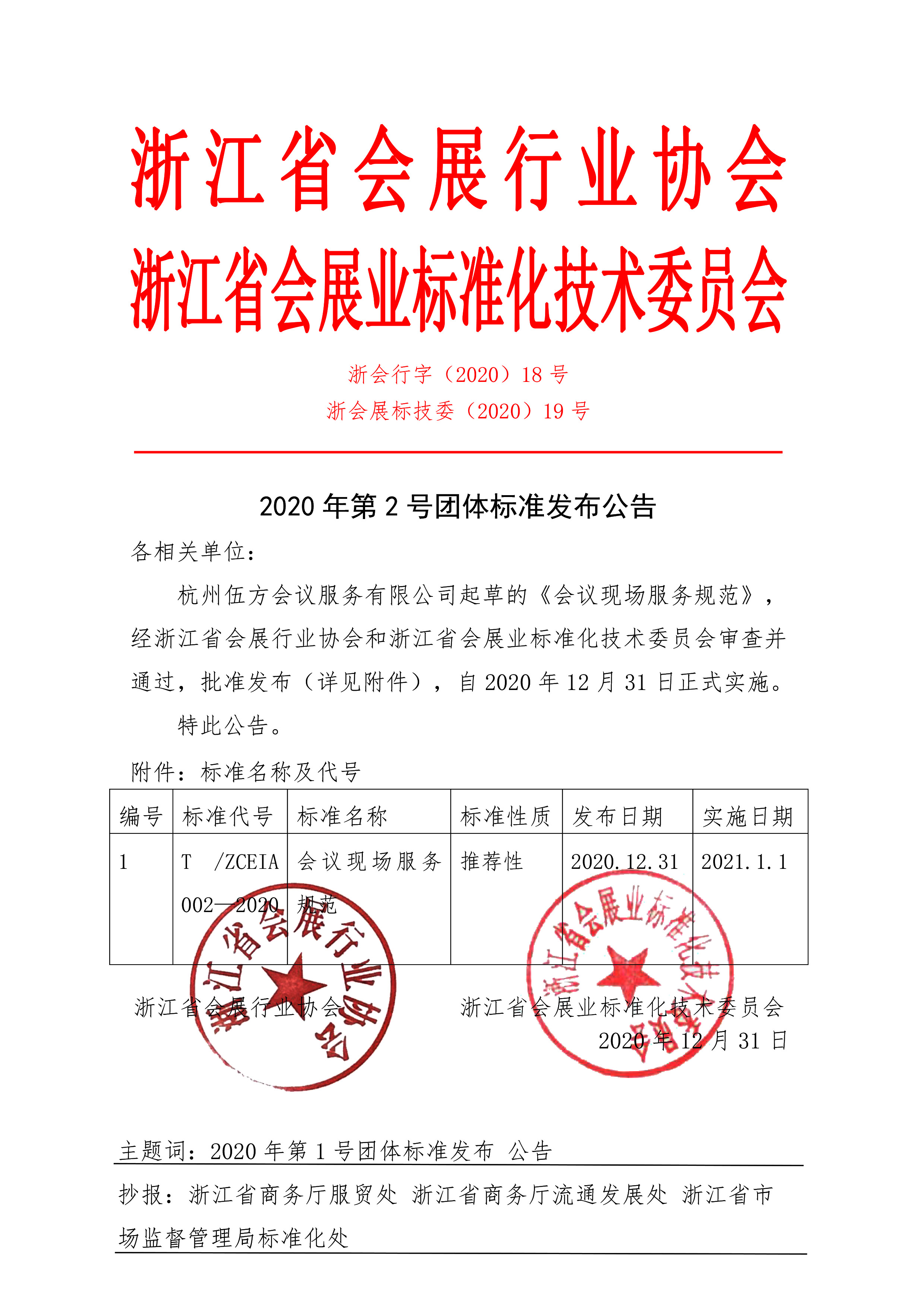 杭州伍方會(huì)議服務(wù)有限公司起草的《會(huì)議現(xiàn)場服務(wù)規(guī)范》,經(jīng)浙江省會(huì)展行業(yè)協(xié)會(huì)和浙江省會(huì)展業(yè)標(biāo)準(zhǔn)化技術(shù)委員會(huì)審查并通過,批準(zhǔn)發(fā)布,自2021年1月1日正式實(shí)施。